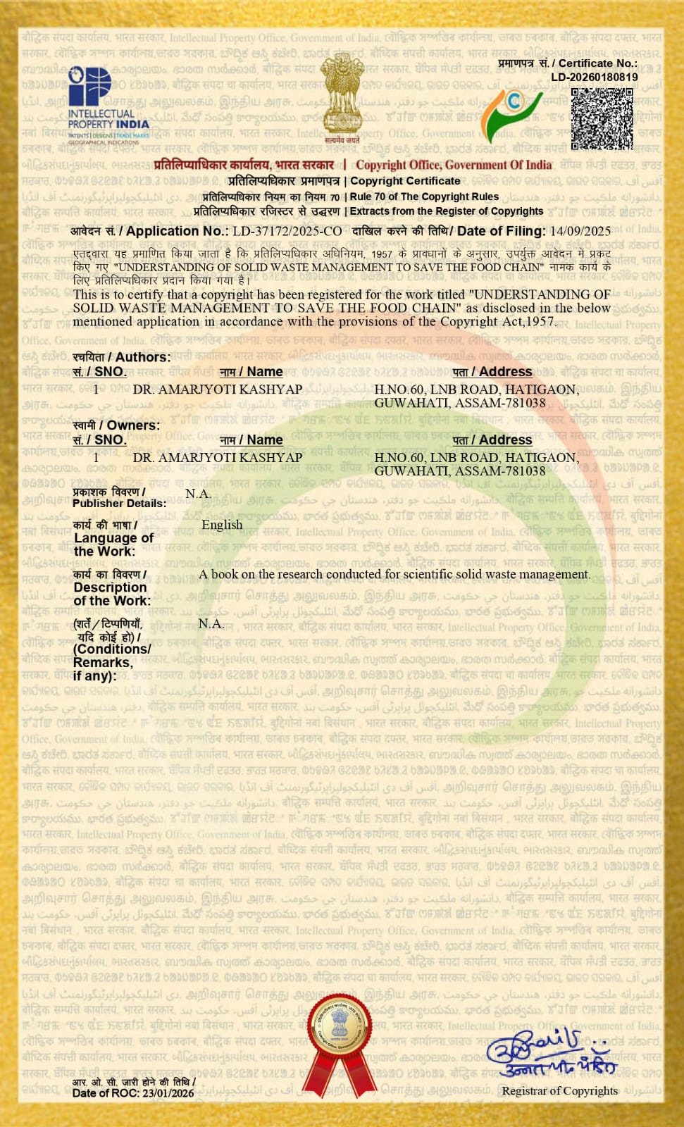 "UNDERSTANDING OF SOLID WASTE MANAGEMENT TO SAVE THE FOOD CHAIN" which has opened a new dimension on Environmental Management, received the Copyright.